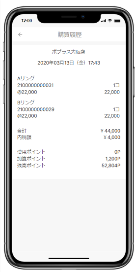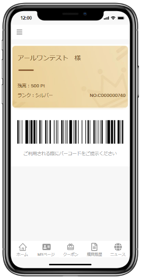 お客様名、ポイント残高、会員ランク、会員番号、会員バーコードが表示できます。