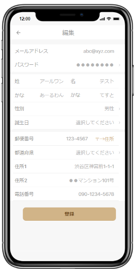氏名、性別、誕生日、住所、電話番号、メールアドレス、ログインに必要なパスワードなど、会員情報として必要な情報を設定することができます。